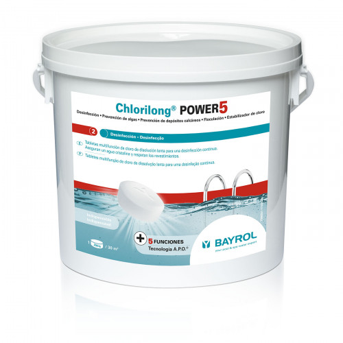 IVA incluidoChlorilong® Power 5 Funciones es una tableta multifunción de cloro de 250 g de disolución lenta con las siguientes propiedades: desinfección continua para eliminar las bacterias y la turbiedad del agua de la piscina, destrucción de las algas, floculación y estabilización del cloro y de la dureza.
